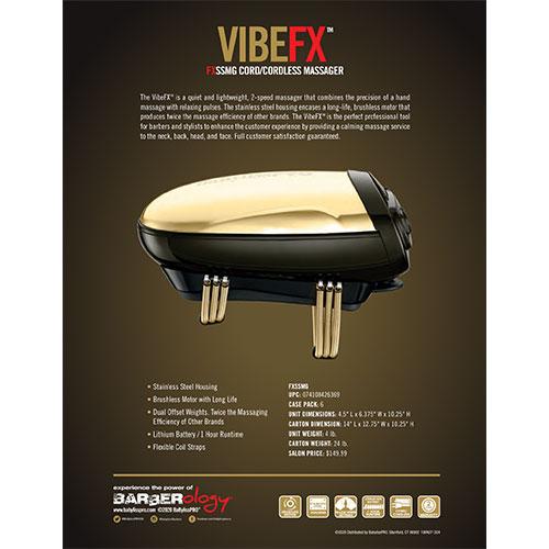 The VibeFX is a quiet and lightweight 2-speed massager that combines the precision of a hand massage with relaxing pulses. The stainless housing encases a long life, a brushless motor that produces twice the massage efficiency of other brands. The VibeFX is the perfect professional tool for barber and stylists to enhance the customer experience by providing a calming massage service to the neck, back, head, and face.