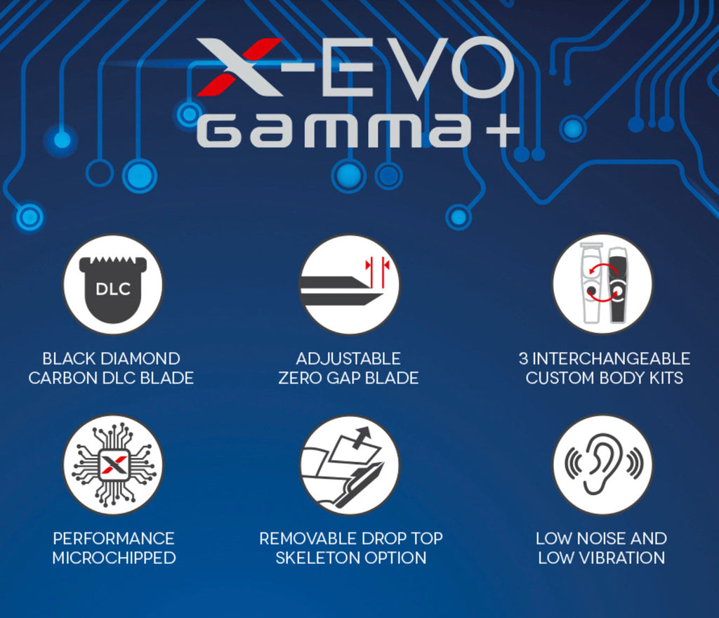 The fully modular X-Evo trimmer touts different interchangeable components – top-housing/axis shield and full housing. Engineered to be perfectly balanced in your hand, the X-Evo includes Matte Gold, Matte Rose Gold, and Matte Chrome body kits to create additional custom modifications.